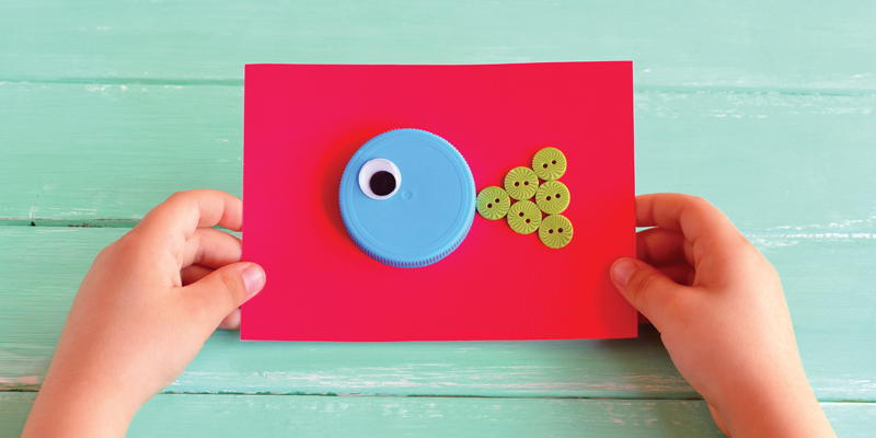 2. Letakkan kartu secara melebar. Tempelkan tutup galon air pada 1/3 bagian kertas sebagai kepala ikan.
