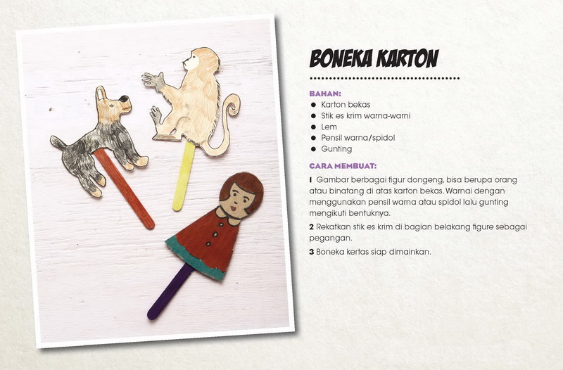 Kali ini, Weekend Workshop (WEWO) mengajak Anda dan si kecil membuat boneka karton dan panggung boneka, dari barang-barang sederhana dan mudah didapatkan. Cara pembuatannya juga tidak sulit, kok. Untuk karakter boneka, sesuaikan dengan cerita yang akan Anda dongengkan untuk si kecil, ya.