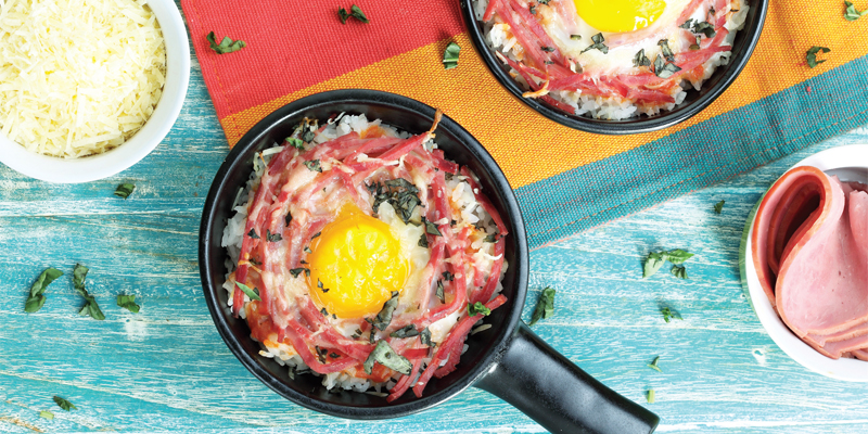 - Siapkan 6 buah ramekin @200 ml. Isi bahan ke dalam ramekin secara berurut: nasi, saus pizza, smoked beef, dan sedikit keju. Ceplokkan telur di atasnya. Taburi kembali dengan sisa keju dan daun basil.