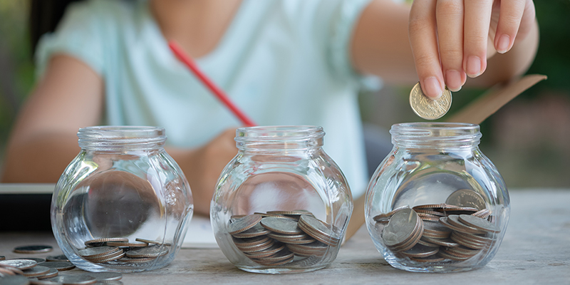 Siapkan 3 wadah kosong, bisa stoples, botol, atau celengan bermotif lucu. Beri label di masing-masing wadah, yakni ‘Tabungan’, ‘Pengeluaran’, dan ‘Berbagi’. Setiap kali anak Anda menerima uang, bagi uang itu secara merata di antara wadah-wadah tersebut.