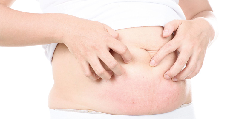Salah satu kejadian alergi yang identik dengan wanita hamil dan melahirkan adalah polymorphic eruption of pregnancy (PEP) dan pruritic urticarial papules and plaques of pregnancy (PUPPP). Alergi ini ditandai dengan gejala munculnya ruam kulit kemerahan di sekitar perut, dapat terjadi pada akhir trimester ketiga atau saat proses persalinan. Penyebab utama kasus ini belum diketahui pasti, namun sebuah penelitian di Israel mengaitkan kejadian ini dengan hipertensi saat hamil dan penggunaan obat induksi saat proses bersalin.