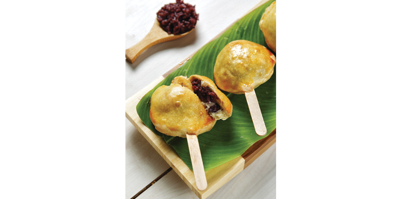 4. Ambil selembar kulit molen, taruh 1 sendok makan ketan hitam kukus ke atasnya, ratakan. Taruh stik di tengahnya. Tumpuk dengan pisang dan 2 sendok teh unti.